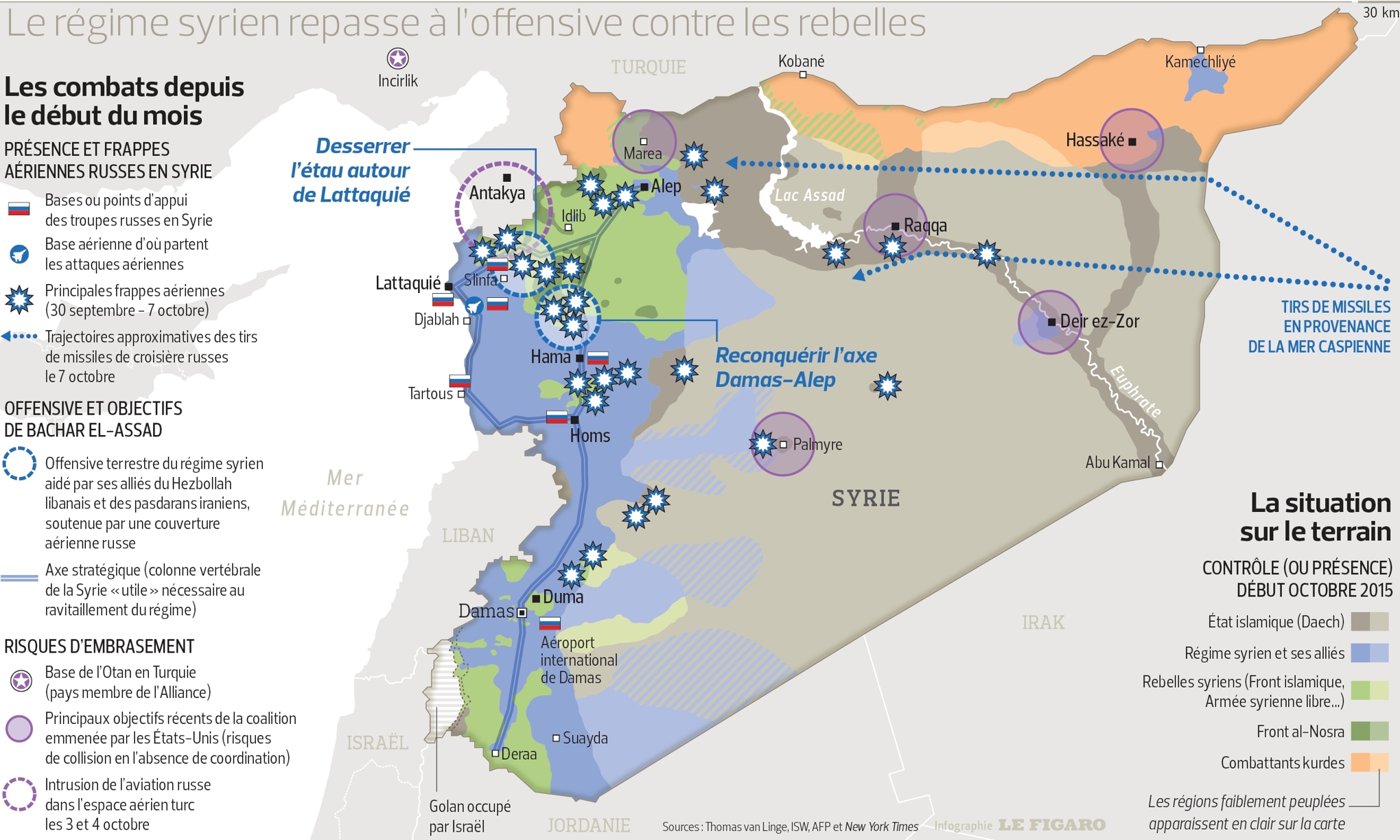 Depuis, les frappes sont quotidiennes. Selon les services de renseignement occidentaux, 20% des bombardements russes concerneraient Daesh, 80% visant les autres mouvements rebelles, dont ceux que l’Occident qualifie de « modérés ». Le président Poutine a demandé aux Américains de préciser quels étaient, selon eux, ces « modérés ». Il est en attente de réponse puisque l’Armée syrienne libre (ASL) est quasi inexistante sur le terrain en dehors du front sud (où les Russes n’opèrent pas) et de quelques éléments éparpillés ici ou là. L’immense majorité des rebelles sont des salafistes-djihadistes qui dépendent, soit d’Al-Qaida « canal historique », soit de Daesh [5].