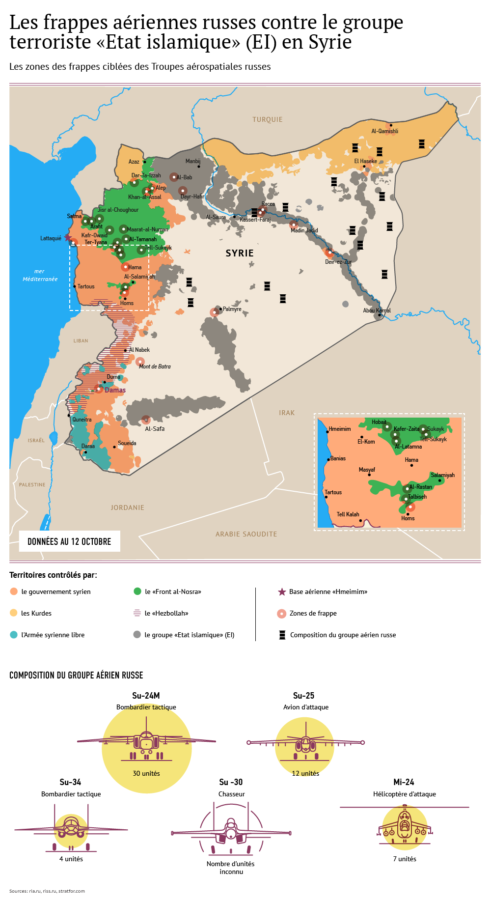 Les Russes ont ensuite acheminé aéronefs, personnels et matériels nécessaires à leur mise en œuvre. Ainsi, aux 4 Su-30 signalés précédemment, sont venus s’ajouter 12 Su-25 et 12 Su-24. Ils ont été rejoints, le 28 septembre, par six Su-34. Une trentaine d’hélicoptères Mi-24, Mi-8 et Ka-27/28 Hip ont également été déployés sur plusieurs sites. Parallèlement, les nombreux navires russes présents sur zone effectuent des « manoeuvres » dans les eaux territoriales syriennes. Ils peuvent mettent en œuvre des armes anti-aériennes et des batteries mer-sol. Ce sont également eux qui transportent la majorité des matériels passant par le détroit du Bosphore, même si des Antonov An-124 et des IL-76 effectuent aussi des rotations en survolant la mer Caspienne, l’Iran puis l’Irak, pour rejoindre la Syrie. Bien que ce ne soient que des estimations, le nombre de personnels russes déployés serait supérieur à 2 000 – en intégrant 500 fusiliers marins et les personnels embarqués.