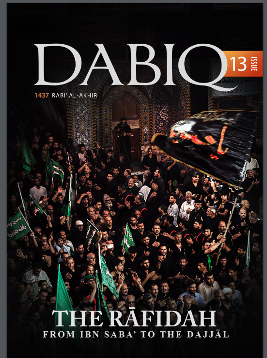 Mais ce sont la page de couverture et le titre qui résument l’idée maîtresse de ce numéro de Dabiq. La photo montre une manifestation religieuse chiite à l’occasion de l’Achoura[2] et le titre « les Rafidah » fait référence à « ceux qui rejettent ». Ce surnom est donné aux chiites qui, selon Daesh, ne reconnaissent pas l’autorité légitime de l’islam, celle des sunnites. En dessous du titre, il y a deux références historiques d’Ibn Saba’ au Dajjal. Abdallah Ibn Saba serait un juif converti à l’islam qui serait à l’origine du chiisme. Ces derniers réfutent la réalité même de son existence affirmant que c’est une pure légende destinée à les diaboliser. Dajjal signifie le « faux messie », aussi assimilé à l’antéchrist. Il est également qualifié par les sunnites de « Satan ».