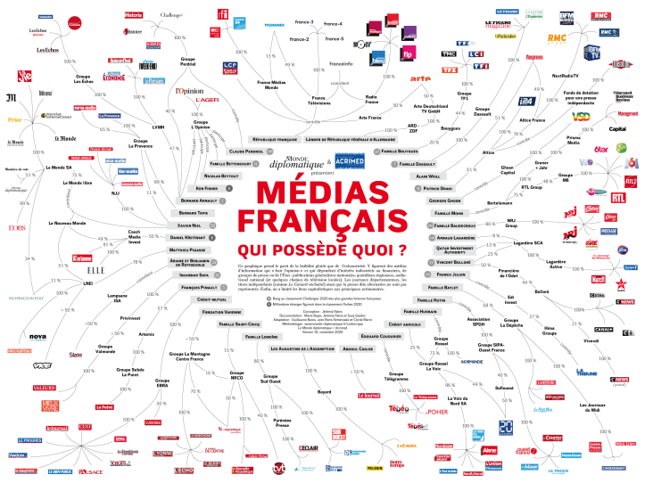 Plutôt que l’exhaustivité, nous avons ici fait le choix de la lisibilité, en simplifiant l’information. Ainsi, seuls les principaux propriétaires des médias sont indiqués ici, plutôt que la multitude de petits actionnaires qui cohabitent souvent avec eux.