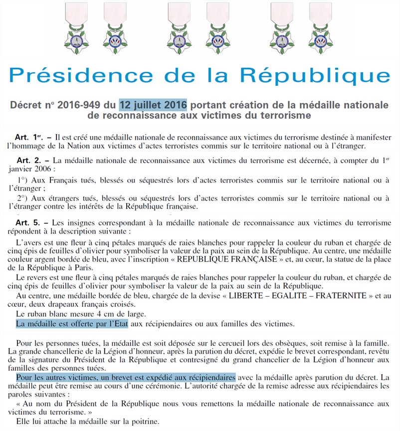 C’est un décret qui est passé inaperçu et qui apparaît désormais comme un impressionnant présage. Le 13 juillet, veille de l’attentat de Nice, était officiellement créée « la médaille nationale de reconnaissance aux victimes du terrorisme ». L’insigne, une fleur à cinq pétales blancs intercalés avec des oliviers, avec au revers deux drapeaux français croisés et la devise « Liberté-Égalité-Fraternité », pourra être décerné de manière rétroactive à compter du 1er janvier 2006.