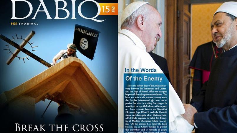 Dans sa rubrique «dans les mots de l’ennemi», l’État islamique vise spécifiquement le pape François montré en photo serrant la main à l’imam de la mosquée Al-Azhar Ahmed el-Tayeb, considéré comme un apostat par les djihadistes. Visiblement documentés, les auteurs citent le pape Benoît XVI dans son livre Foi, vérité, tolérance, où il expliquait que la démocratie «contredit l’essence de l’Islam, qui n’a tout simplement pas le principe de séparation entre sphère politique et sphère religieuse que le christianisme possède depuis le début». «Même si c’est un menteur, il a certainement dit la vérité sur ce sujet», commentent les djihadistes, «montrant par-là que beaucoup d’apostats de l’islam, comme les imams occidentaux ou les professeurs de prétendues universités islamiques, ont une bien moindre compréhension de l’islam que Benoît l’incroyant».