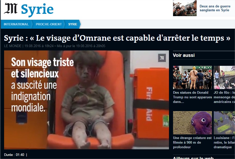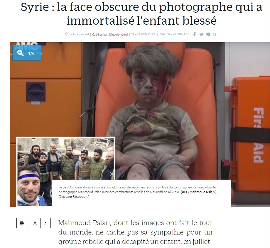 Je comptais donc pointer le “2 poids 2 mesures” classique en Syrie, où le pauvre-petit-garçon-tout-mignon-blessé-par-les-méchants-assado-russes fait la Une des médias, “plein d’émotions” devant “le vrai visage de la guerre en Syrie”. Et cela fait la Une de tous les médias.. Mais il y a bien mieux en fait, à propos de cette photo…