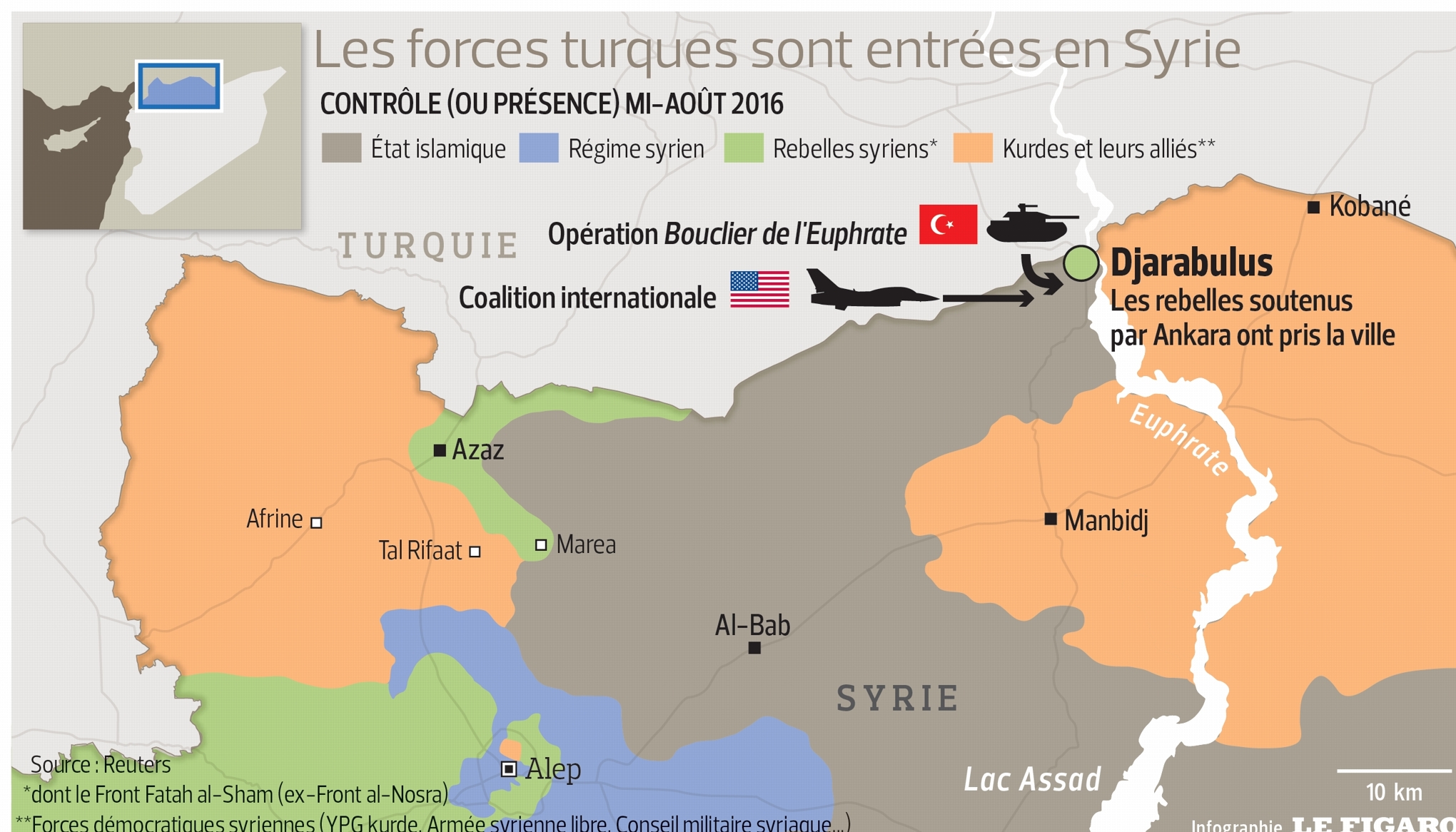 L’opération a été précédée de tirs d’artillerie ainsi que de raids de l’aviation turque et de la coalition formée par les États-Unis. Ankara avait annoncé au cours du week-end vouloir jouer un rôle plus actif en Syrie et cette opération baptisée «Bouclier de l’Euphrate» est la plus ambitieuse de la Turquie depuis le début du conflit syrien il y a cinq ans et demi.