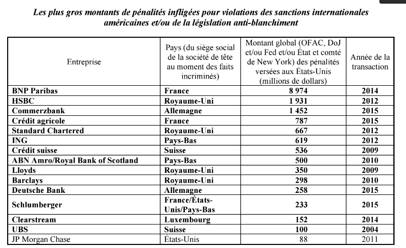 Les banques européennes ont payé pratiquement toutes les plus grosses amendes américaines au titre de la violation des embargos internationaux et elles ont versé les deux tiers des plus grosses amendes au titre des affaires de corruption internationales, constatent les auteurs du rapport. Au total elles ont versé « plusieurs dizaines de milliards de dollars, en quelques années », ce qui représente « un prélèvement significatif sur les économies européennes au bénéfice des finances publiques américaines ».