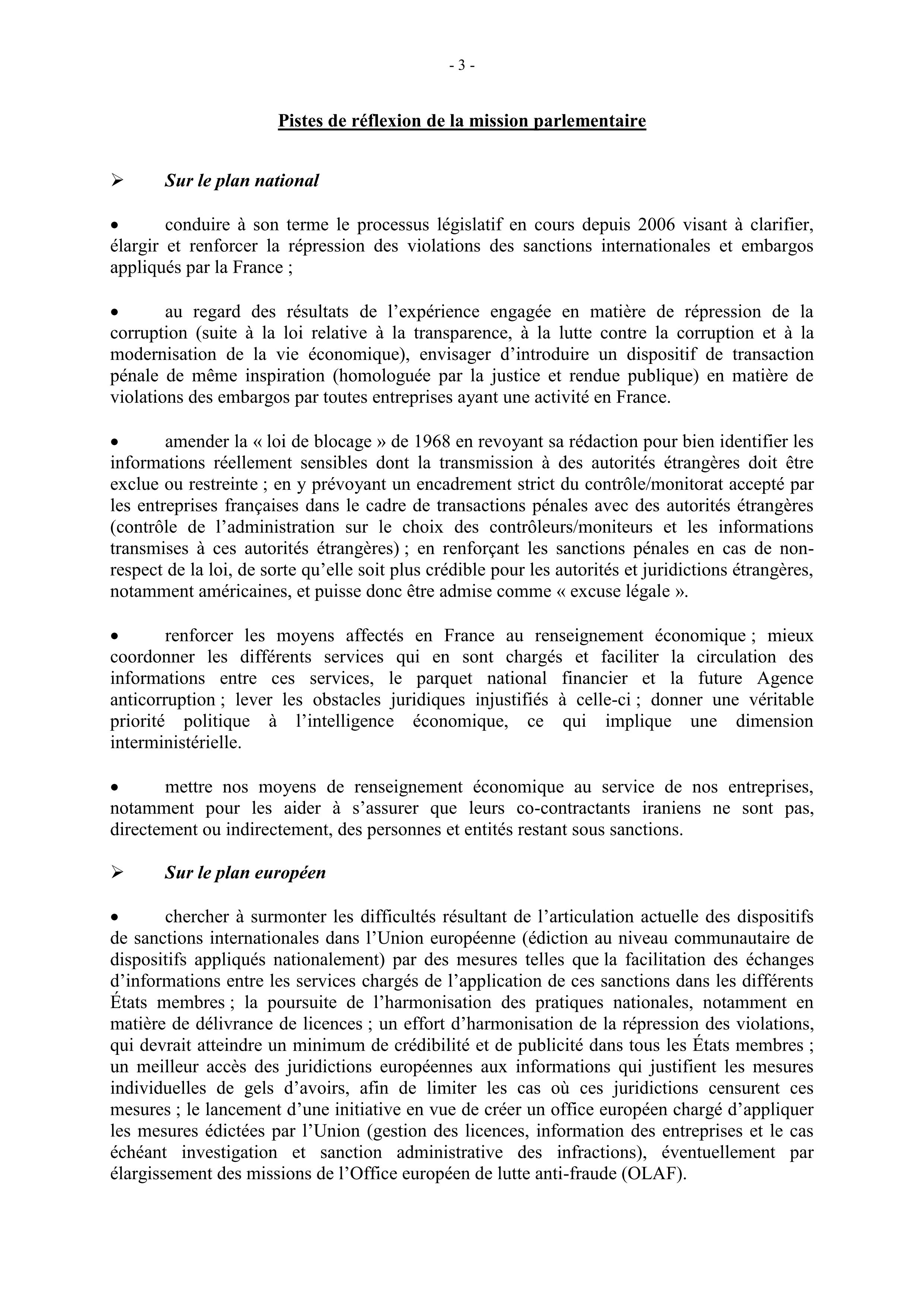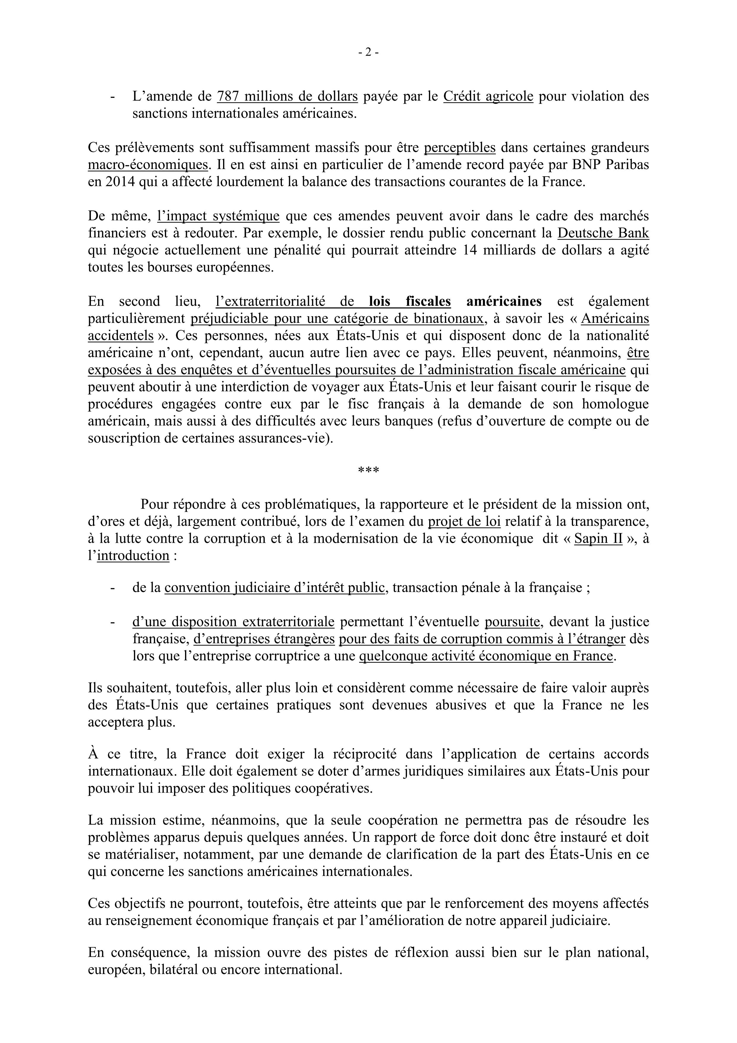 Berger et Lellouche, qui font état de leur « trouble », s’interrogent sur un possible « ciblage » des entreprises européennes et sur « la loyauté de certaines pratiques des administrations américaines ». S’ils jugent légitimes certaines sanctions (contre Volkswagen ou les banques Suisses, par exemple), ils ont plus de mal à comprendre pourquoi des entreprises non-américaines sont sanctionnées pour des faits de corruption « au bénéfice d’officiels non-américains pour obtenir des contrats sur un sol non-américain ». Ils trouvent également fort de café que les autorités américaine « prétendant interdire à des banques non-américaines d’opérer certaines transactions financières avec des entités ou des pays également étrangers… »