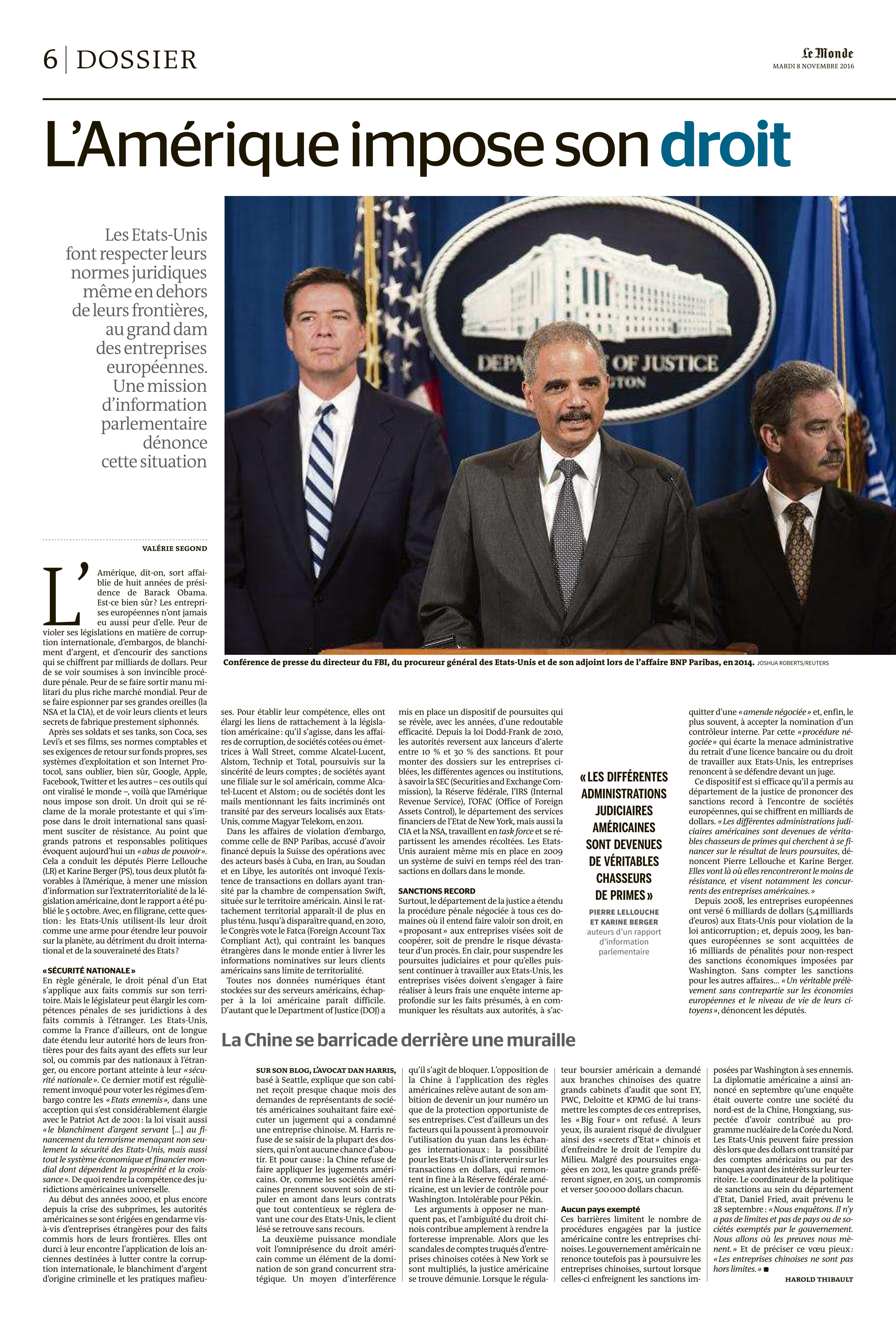 Dans l’ultime ligne droite de l’examen de la loi Sapin II, les deux auteurs ont réussi à glisser la semaine dernière quelques amendements visant à préparer la contre-offensive : désormais, la justice française pourra poursuivre une entreprise étrangère (comprendre : américaine) pour peu qu’elle «exerce tout ou partie de son activité sur le territoire français». Histoire de rééquilibrer le chantage judiciaire, car «si c’est de bonne guerre, autant en faire autant.»