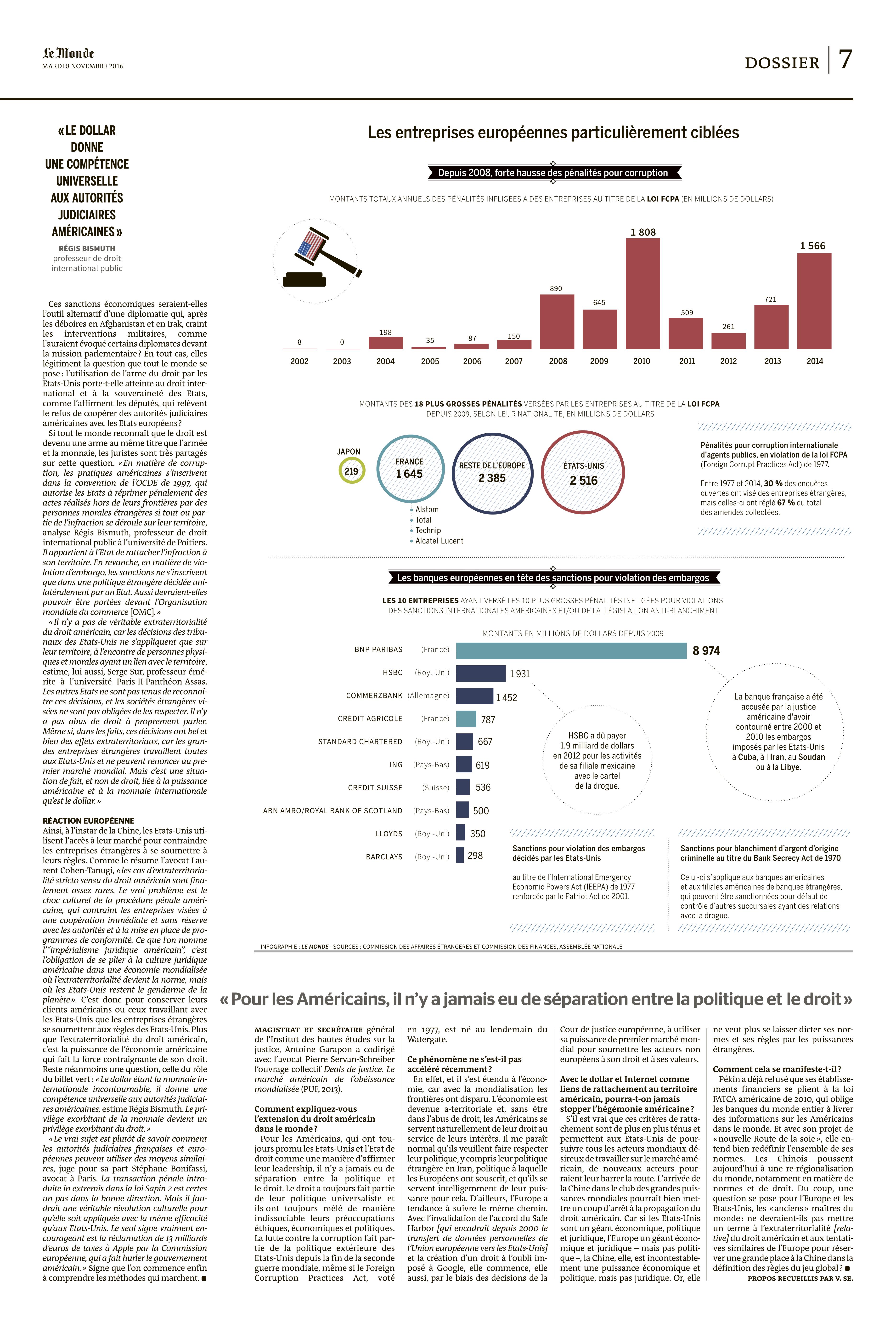 A les entendre, il y aurait encore pire. Dans le cadre des poursuites pénales initiées aux Etats-Unis, les multinationales occidentales visées acceptent, non pas de plaider coupable, mais de payer pour éteindre de longues et coûteuses poursuites judiciaires. Une forme de repentance empreinte de protestantisme, au cours de laquelle elles doivent se mettre à nu, dévoiler petits et grands secrets internes. Et se soumettre à un suivi longitudinal américain.
