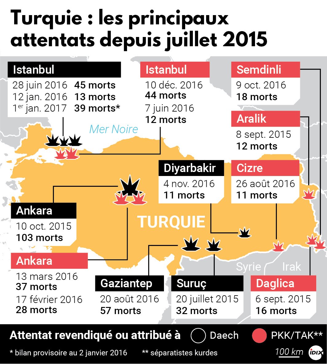 Trois semaines plus tôt, deux déflagrations ébranlaient le quartier très passant de Beşiktaş, à quelques kilomètres d’Ortaköy. Ce double attentat, qui ciblait les forces de polices déployées à l’occasion d’un match de football, est attribué et revendiqué par le TAK, « les Faucons de la Liberté du Kurdistan », un groupe dissident du PKK.