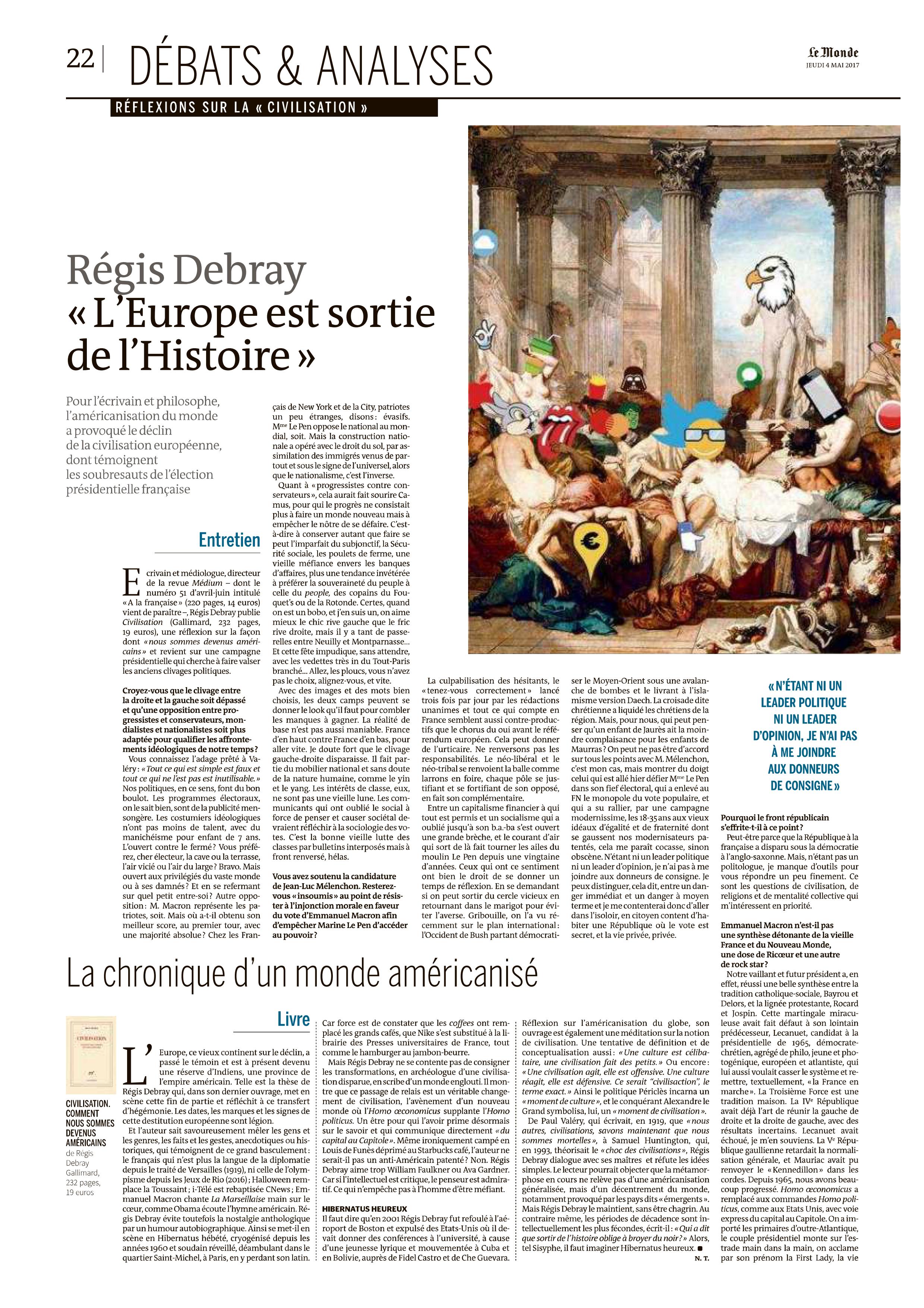 En pleine campagne présidentielle, il publie aujourd’hui : «Civilisation : Comment nous sommes devenus américains», chez Gallimard. A l’affirmative… Le philosophe entérine l’absence chez nos dirigeants de cette conscience historique qui fait «humanité», raconte comment l’Europe est devenue un canton de l’Amérique, illustre les transferts d’hégémonie et s’excuse de son abus d’anglicisme. Parler la langue de l’ennemi pour mieux le combattre ou lui résister, oui mais comment ? Habit de deuil déconseillé, Régis Debray appelle à rester lucide et optimiste: les «décadences» peuvent être aimables, fécondes voir même indispensables. Plaidoyer pour une transmission repensée.