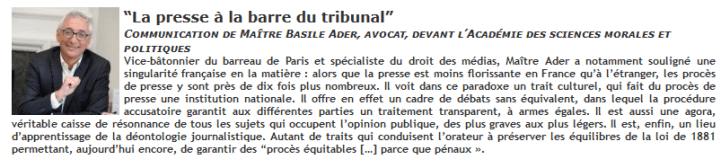Vice-bâtonnier du barreau de Paris et spécialiste du droit des médias, Maître Ader a notamment souligné une singularité française en la matière : alors que la presse est moins florissante en France qu’à l’étranger, les procès de presse y sont près de dix fois plus nombreux. Il voit dans ce paradoxe un trait culturel, qui fait du procès de presse une institution nationale. Il offre en effet un cadre de débats sans équivalent, dans lequel la procédure accusatoire garantit aux différentes parties un traitement transparent, à armes égales. Il est aussi une agora, véritable caisse de résonance de tous les sujets qui occupent l’opinion publique, des plus graves aux plus légers. Il est, enfin, un lieu d’apprentissage de la déontologie journalistique. Autant de traits qui conduisent l’orateur à préserver les équilibres de la loi de 1881 permettant, aujourd’hui encore, de garantir des “procès équitables […] parce que pénaux ».