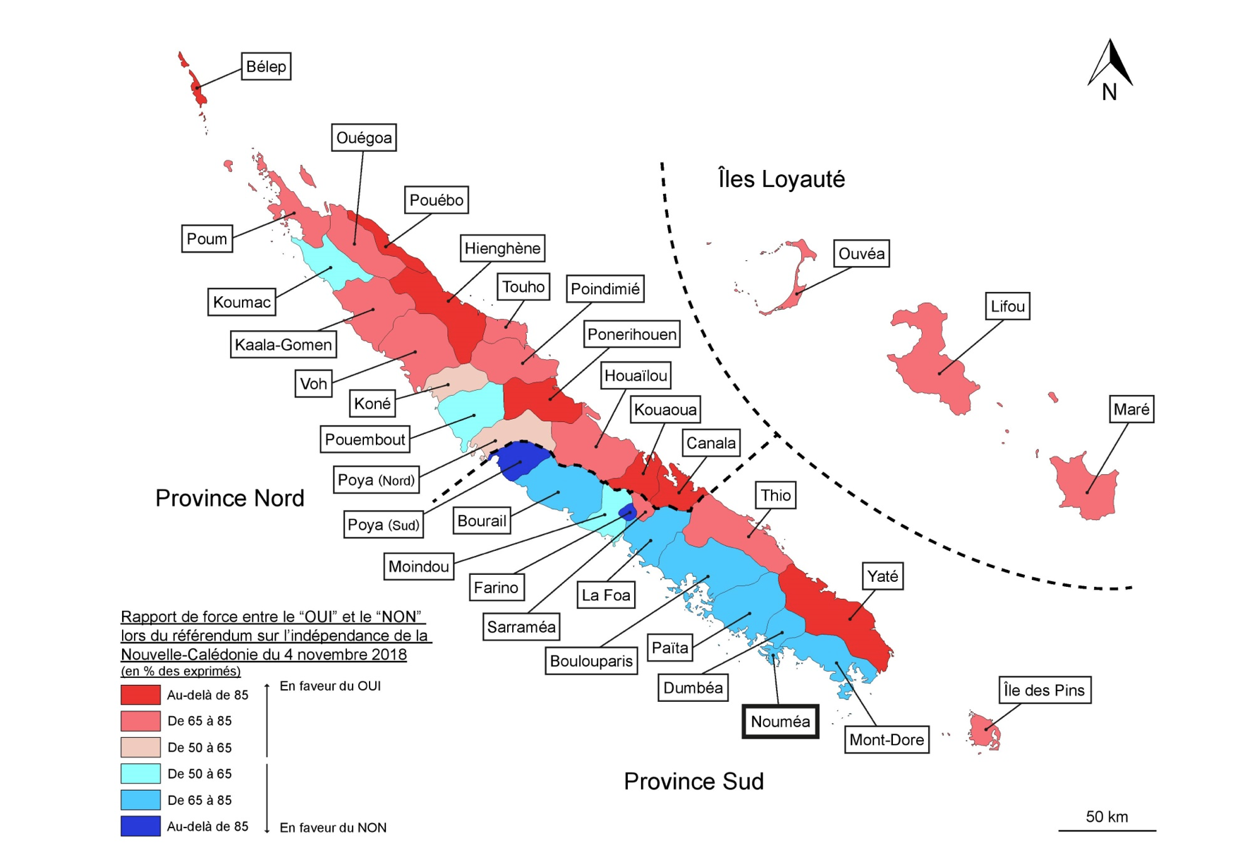 Bien qu’également situées sur la côte ouest, les communes de Kaala-Gomen et Koné ont majoritairement voté pour le oui du fait d’une forte présence mélanésienne. Mais les résultats apparaissent également extrêmement clivés entre les bureaux de vote d’une même commune. À Kaala-Gomen, le oui atteint autour de 90 % des voix dans les bureaux de vote localisés dans les territoires des différentes tribus, contre 55 % dans le bureau de vote de la mairie, correspondant à une zone d’habitation ethniquement plus mixte, et 33 % seulement dans le village de Ouaco, situé sur le littoral mais dépendant administrativement de Kaala-Gomen. Ouaco, fief historique de la famille Lafleur[7] et des éleveurs caldoches, a voté à 66 % pour le non, ce score en faisant le seul point d’appui majoritaire pour ce camp quand les autres bureaux de vote communaux votaient massivement pour le oui. Dans la commune de Koné, de fortes amplitudes s’observent également, avec par exemple des scores de 96 % pour le oui dans la tribu d’Atéou ou de 93 % dans celle de Tiaoué, mais de 70 % pour le non dans le bureau situé dans le quartier des Allamandas.