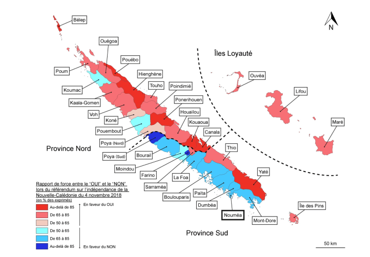Pierre-Christophe Pantz, docteur en géopolitique et spécialiste de géographie électorale, détaille les clivages qui se jouent « également à l’intérieur des communes elles-mêmes. À Nouméa, il y a seulement deux bureaux de vote où le oui est sorti en tête et ils correspondent à des quartiers composés de Kanak, d’Océaniens et de classes populaires ».