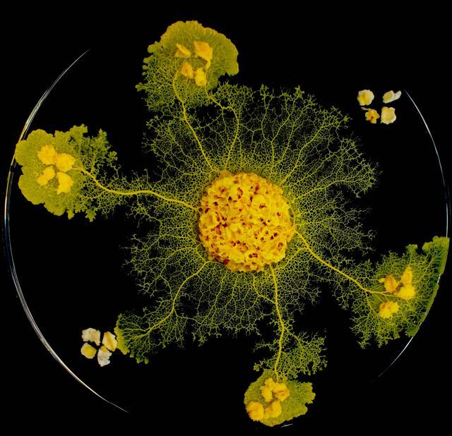 Un jour aux États-Unis une dame trouve dans son jardin une énorme masse jaune de la texture d’une éponge. Les policiers sont appelés et, paniqués, lui tirent dessus, sans aucun effet, les pompiers le brûlent mais, le lendemain, la chose a doublé de taille. C’est un blob. Évidemment, cela a donné lieu à un film d’épouvante : « Beware of the Blob » avec Steve Mac Queen. A-delà de l’anecdote, le blob semble immortel. Coupé en morceaux, il cicatrise en deux minutes. Ses seuls ennemis sont la lumière et la sécheresse. Mais il peut « hiberner », en attendant des jours meilleurs. Le blob – ou physarum polycephalum – n’a pas de neurones, mais est capable d’apprendre et de résoudre des problèmes complexes comme les labyrinthes. Il est même doté d’une personnalité. En effet, les souches se comportent différemment selon leur pays d’origine : l’Américain est plutôt agressif, l’Australien plus pacifique, le Japonais a une tendance à la procrastination… Il est dépourvu de membres mais il bouge, certes lentement. En conditions de laboratoire, il se nourrit de flocons d’avoine et de flans. Bien que dépourvu de cerveau et d’estomac, il parvient à maintenir un apport optimal de nutriments essentiels à sa survie et à sa croissance.