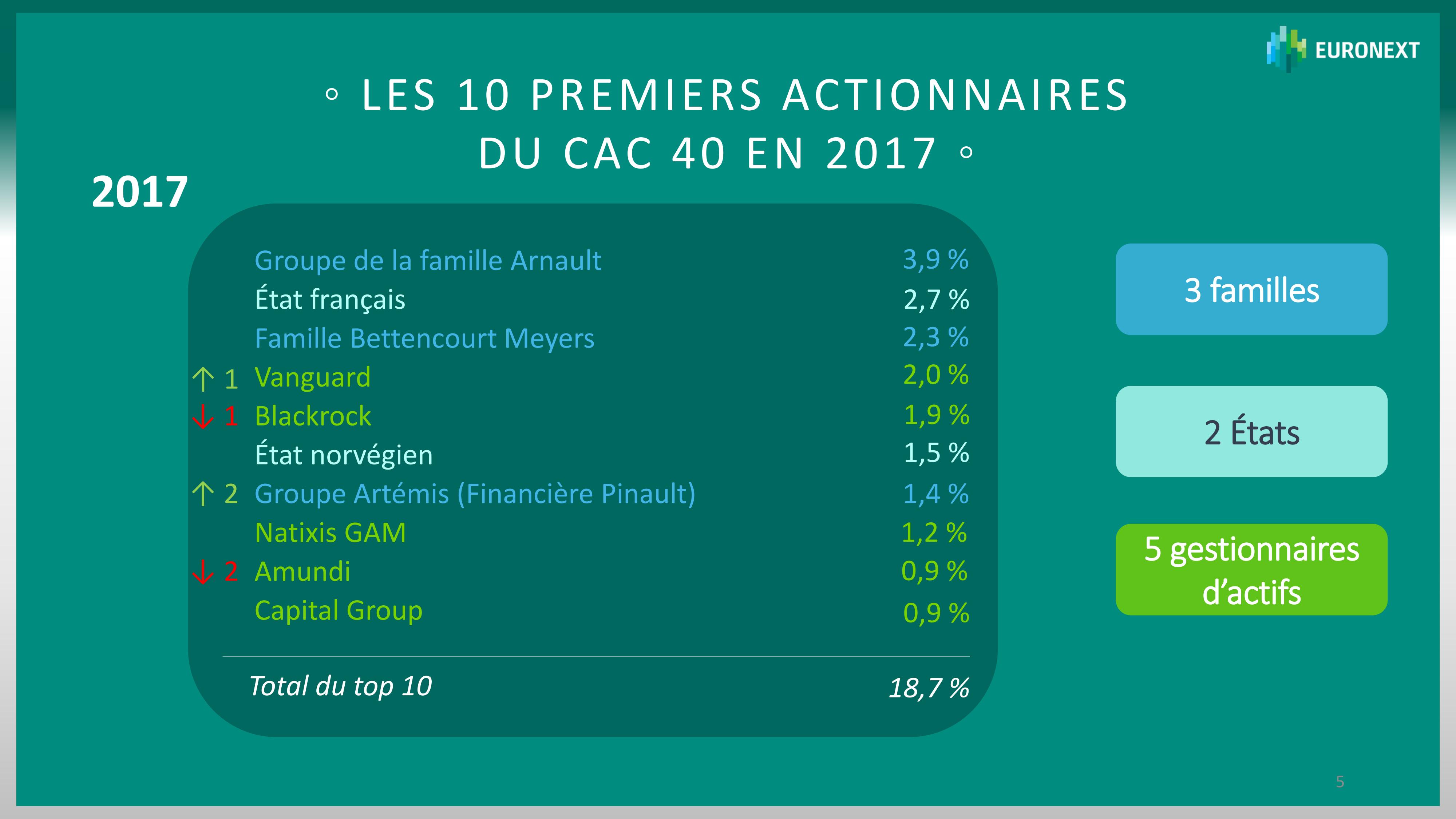 « Trois familles, deux Etats et cinq gestionnaires d’actifs » : ce sont les dix premiers actionnaires du CAC 40, selon le profil dressé par Euronext, l’opérateur de la Bourse de Paris, mais aussi d’Amsterdam, de Bruxelles, de Dublin et de Lisbonne. La deuxième édition de cette étude, publiée ce mardi 15 janvier 2019 à l’occasion de la conférence annuelle d’Euronext, analyse l’actionnariat des sociétés de l’indice CAC 40 et du SBF120 entre fin 2012 et fin 2017, en s’appuyant sur les données publiquement disponibles (rapports annuels, bases de données spécialisées de Morningstar et Factset), qui ont permis d’identifier 60% de l’actionnariat de ces entreprises (du fait notamment de l’absence d’obligation de publication des positions en dessous de 5% du capital auprès de l’Autorité des marchés financiers).