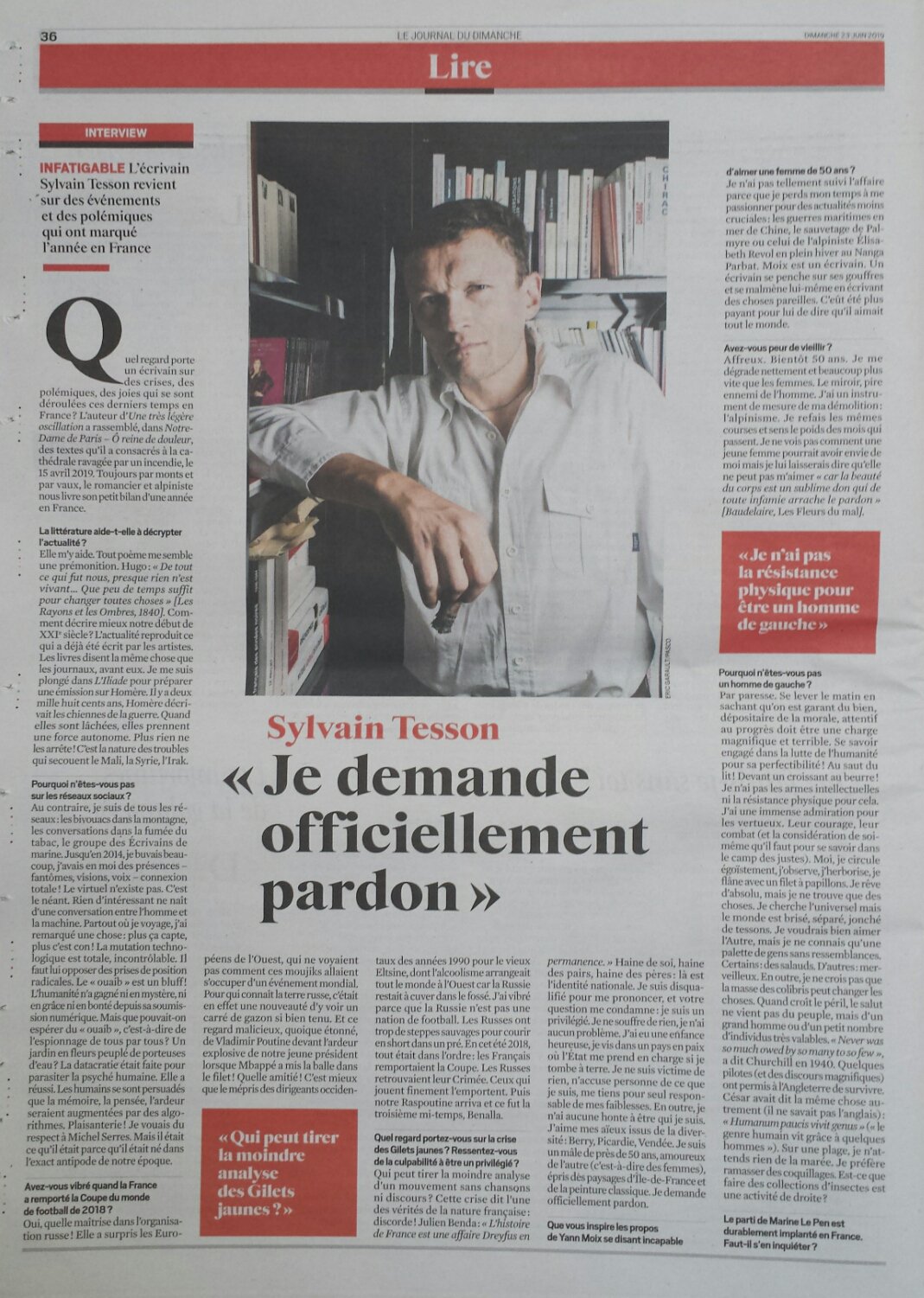 Quel regard porte un écrivain sur des crises, des polémiques, des joies qui se sont déroulées ces derniers temps en France? Sylvain Tesson, l’auteur d’Une très légère oscillation a rassemblé, dans Notre-Dame de Paris – Ô reine de douleur, des textes qu’il a consacrés à la cathédrale ravagée par un incendie, le 15 avril 2019. Toujours par monts et par vaux, le romancier et alpiniste livre au Journal du Dimanche son petit bilan d’une année en France. Coupe du Monde, réseaux sociaux, Benalla, Gilets jaunes, Front national, Alain Delon : il n’élude aucun sujet. Voici quelques extraits de cette interview qui pique.