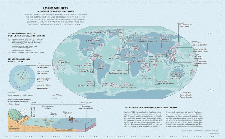 Grand vainqueur à ce jeu-là, les Etats-Unis, qui bénéficient de la plus grande ZEE grâce à leurs frontières maritimes et à quelques îles judicieusement placées dans les océans qui les bordent. La France maintient sa deuxième place au « Monopoly des îles », grâce à ses anciennes colonies, qu’elle conserve vaille que vaille, malgré la menace de perdre des points d’ancrage importants, comme Mayotte, dans l’océan Indien, la Nouvelle-Calédonie, dans le Pacifique et, moins connue, Clipperton, au large du Mexique. Les grandes puissances d’hier et d’aujourd’hui sont attentives à leur emprise maritime – et aux richesses – qu’elle leur procure. Les puissances émergentes ne sont pas en reste : la Chine tente de s’emparer de la mer de Chine méridionale à coups d’îlots artificiels et dispute à l’Inde le contrôle de l’océan Indien. Sans oublier les îles qui vont tout simplement disparaître à cause du réchauffement climatique.